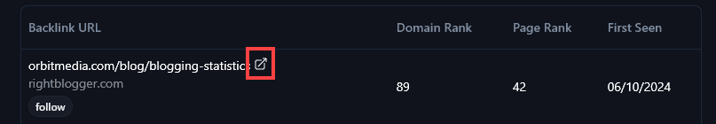 Tip: Look for backlinks with a high domain ranking and page rank. These could be great opportunities for you to pursue, too. Click the “open” link next to the backlink’s URL to see that page.
