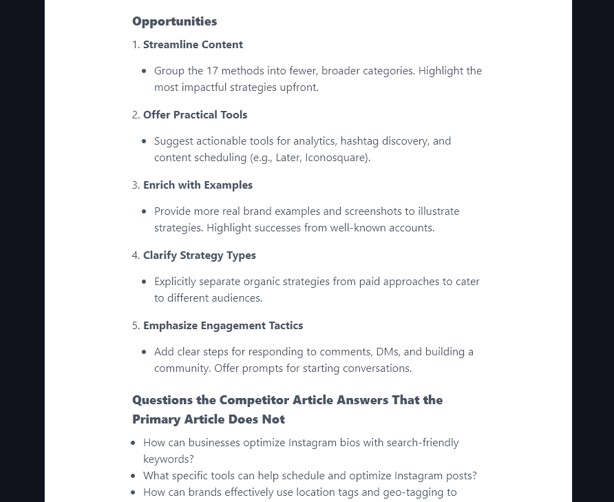 - Content Gaps: Specifics on the gaps between the primary article and the competitor piece, showing where the primary article may be falling short.