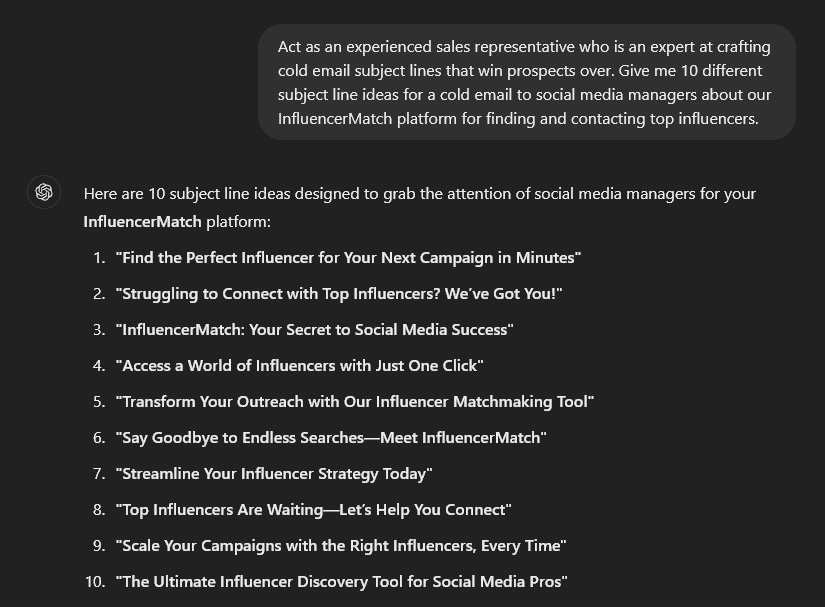 If you’re approaching a prospect for the first time, then getting your subject line right is vital. It gives them their first impression of you. This prompt comes up with engaging, professional subject lines like these: