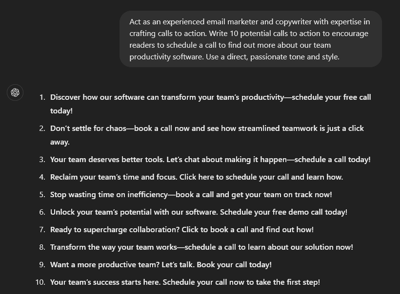 When you already know what you want your email to accomplish, let ChatGPT come up with CTAs that are tailored to your purpose. You can tell the AI what you want people to do, like sign up for a webinar or schedule a call.