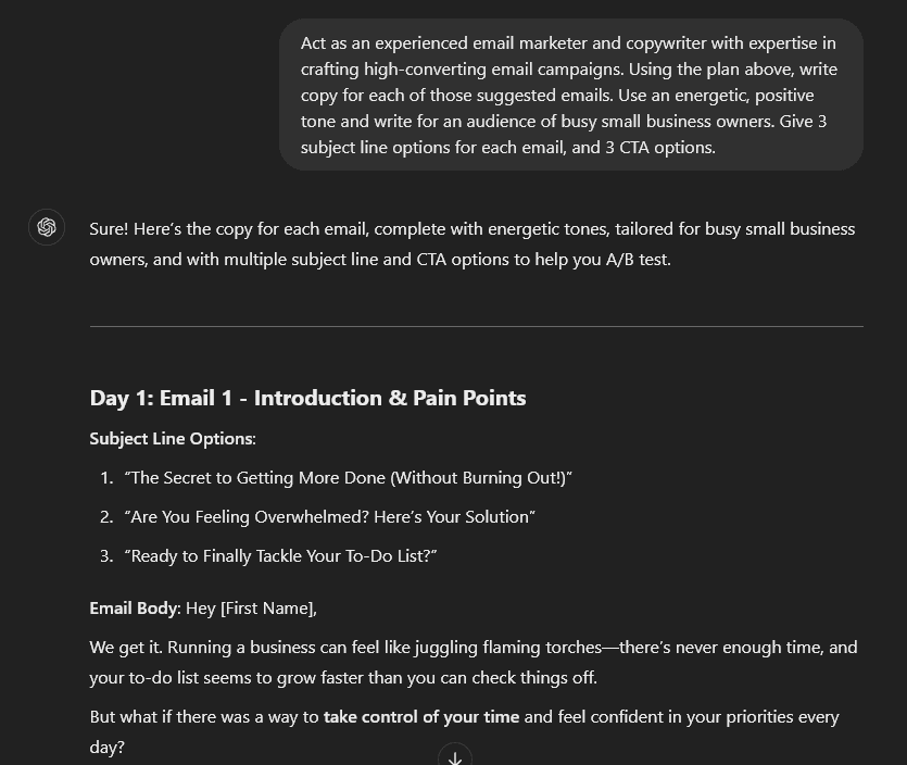 Tip: If you want more fine-tuned control over the emails in your campaign, you can instead use some of the prompts we covered earlier in this article to draft each message separately.