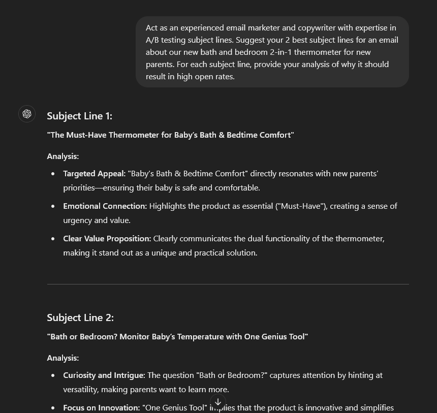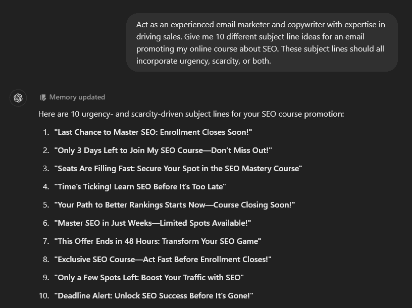 Getting your email opened is the first battle won. Some subject lines will perform dramatically better than others. ChatGPT can give you options for testing, and explain why they’ll work well: