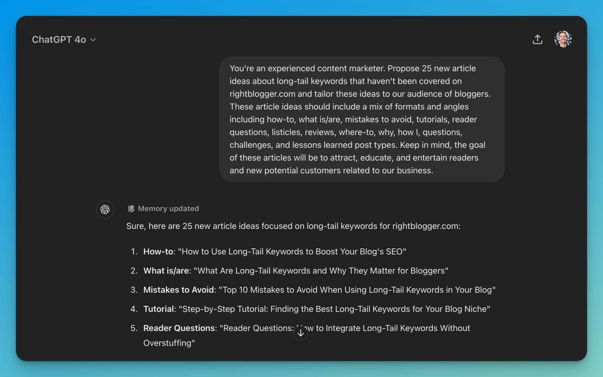 👋 Important Tip: ChatGPT prompts are only as effective as you are. If you type in a one-sentence prompt, don’t expect the outputs to blow you away. If you’re vague, ChatGPT will be working with a very wide range of possibilities. Be extremely specific, wherever you can in your prompting, and your results will be so much stronger. Highly detailed prompting is part of the secret sauce powering RightBlogger, hehe.