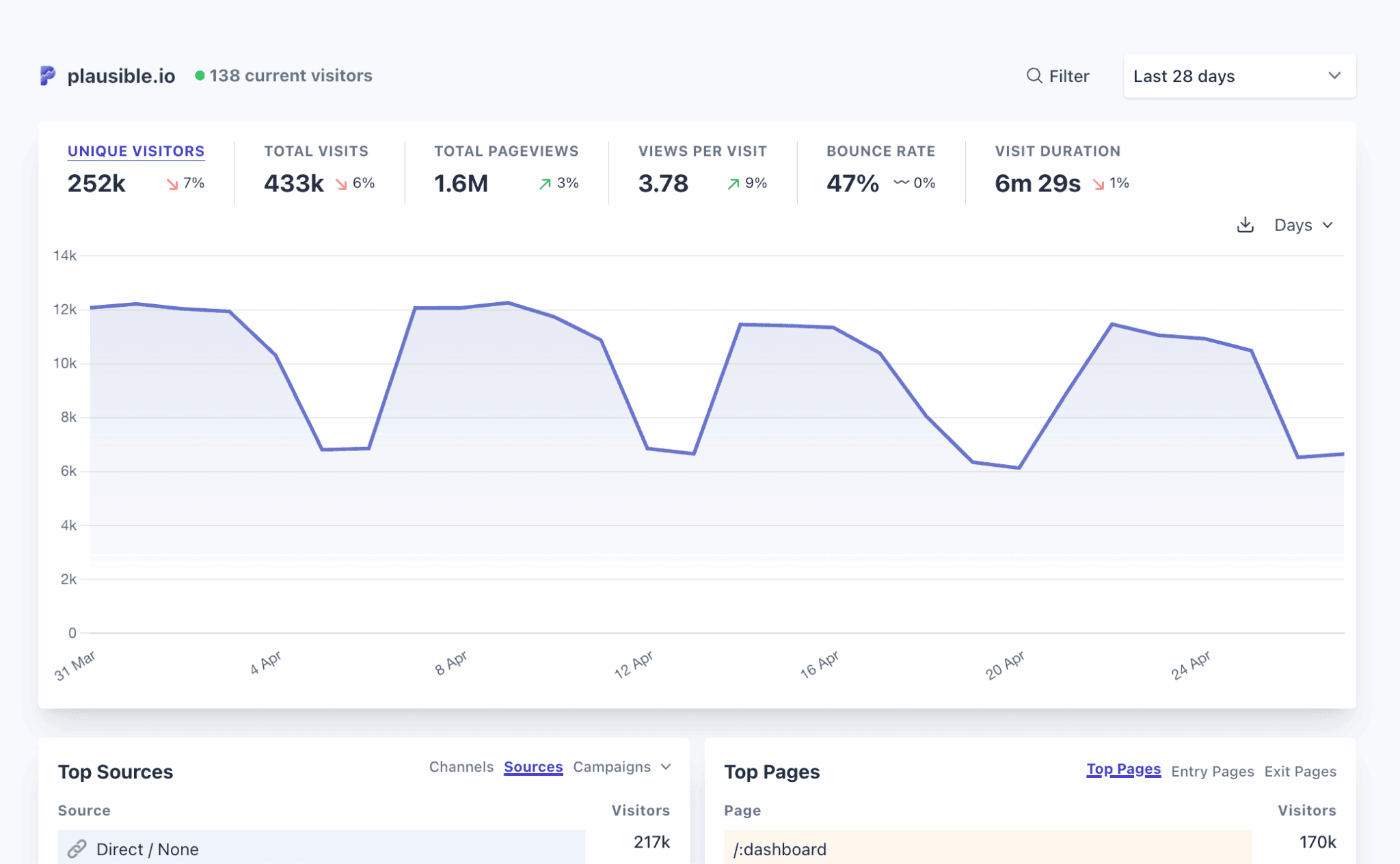 Plausible is similar to Fathom and Simple Analytics. It’s a straightforward and easy-to-use analytics tool. It’s open-source and can be self-hosted. A notable difference is how Plausible collects data. Instead of collecting only non-personal data, it collects, stores and processes IP-address (in a hashed way).
