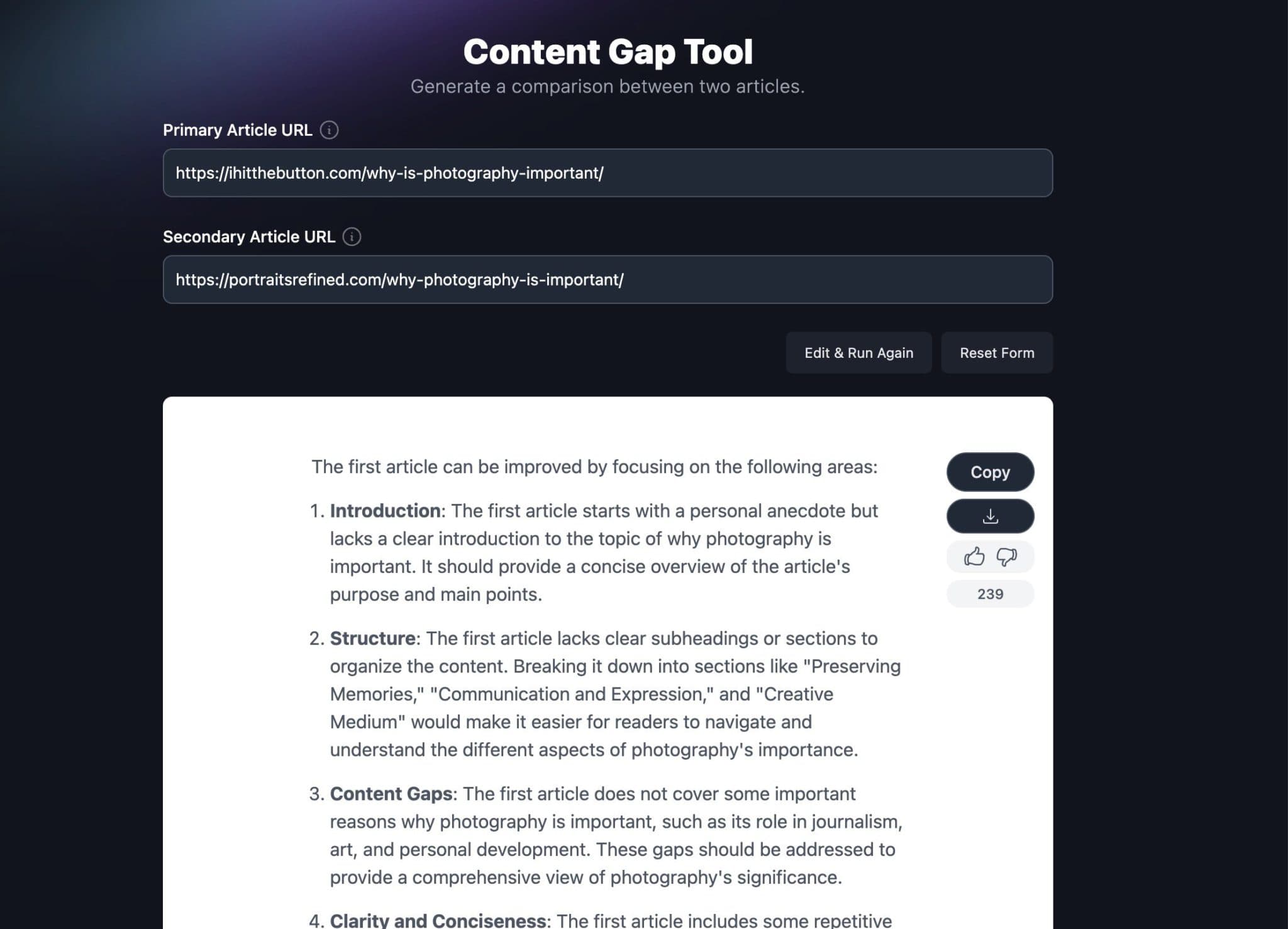 The Content Gap tool compares your article with the top ranking post for a keyword and shows what you might be missing. You can then add sections, details, or FAQs to your post so it better matches searcher intent.