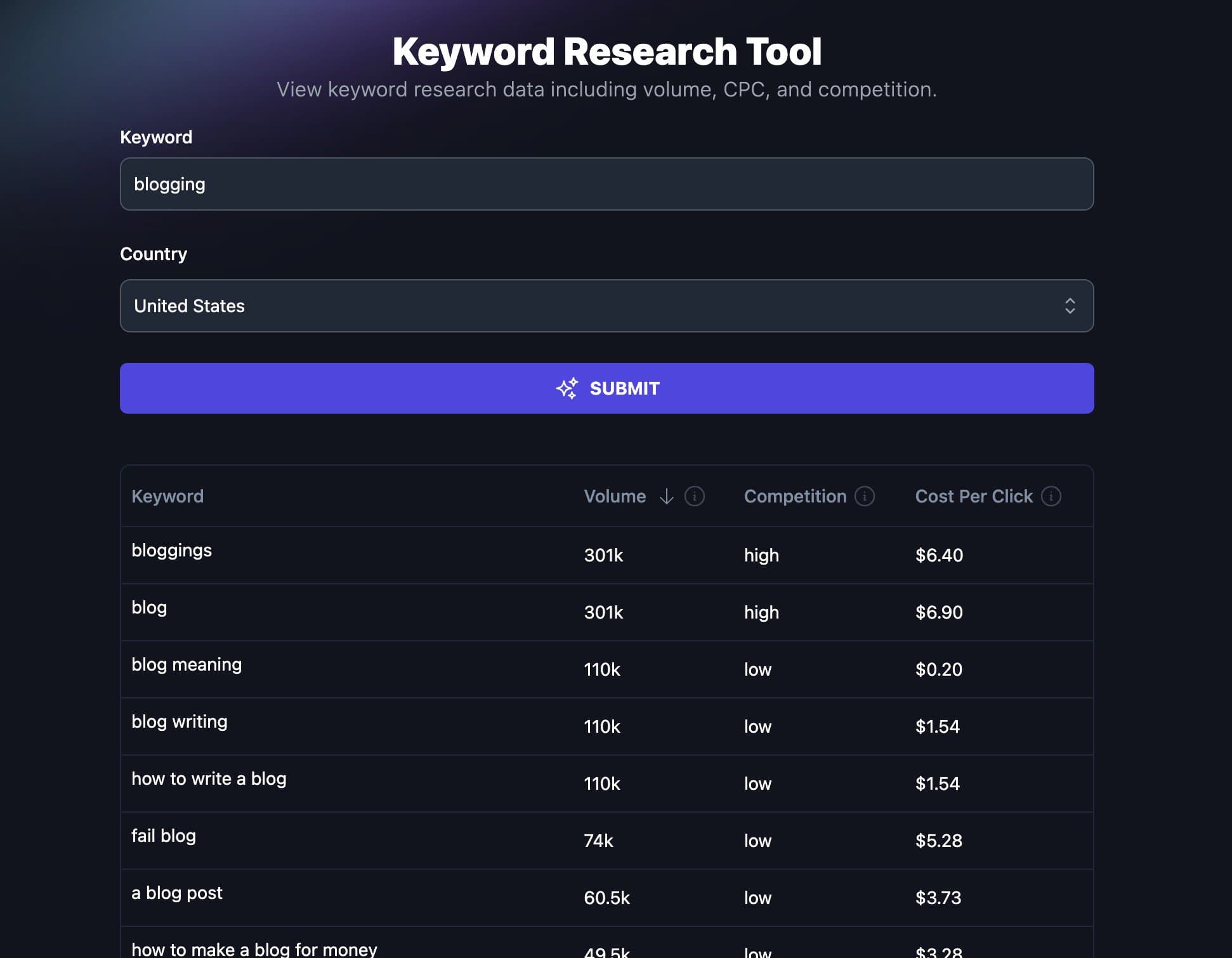 The upgraded keyword research tool lets you filter keywords by country, search volume, competition, and cost per click. This helps you find topics that are both realistic to rank for and have strong earning potential.