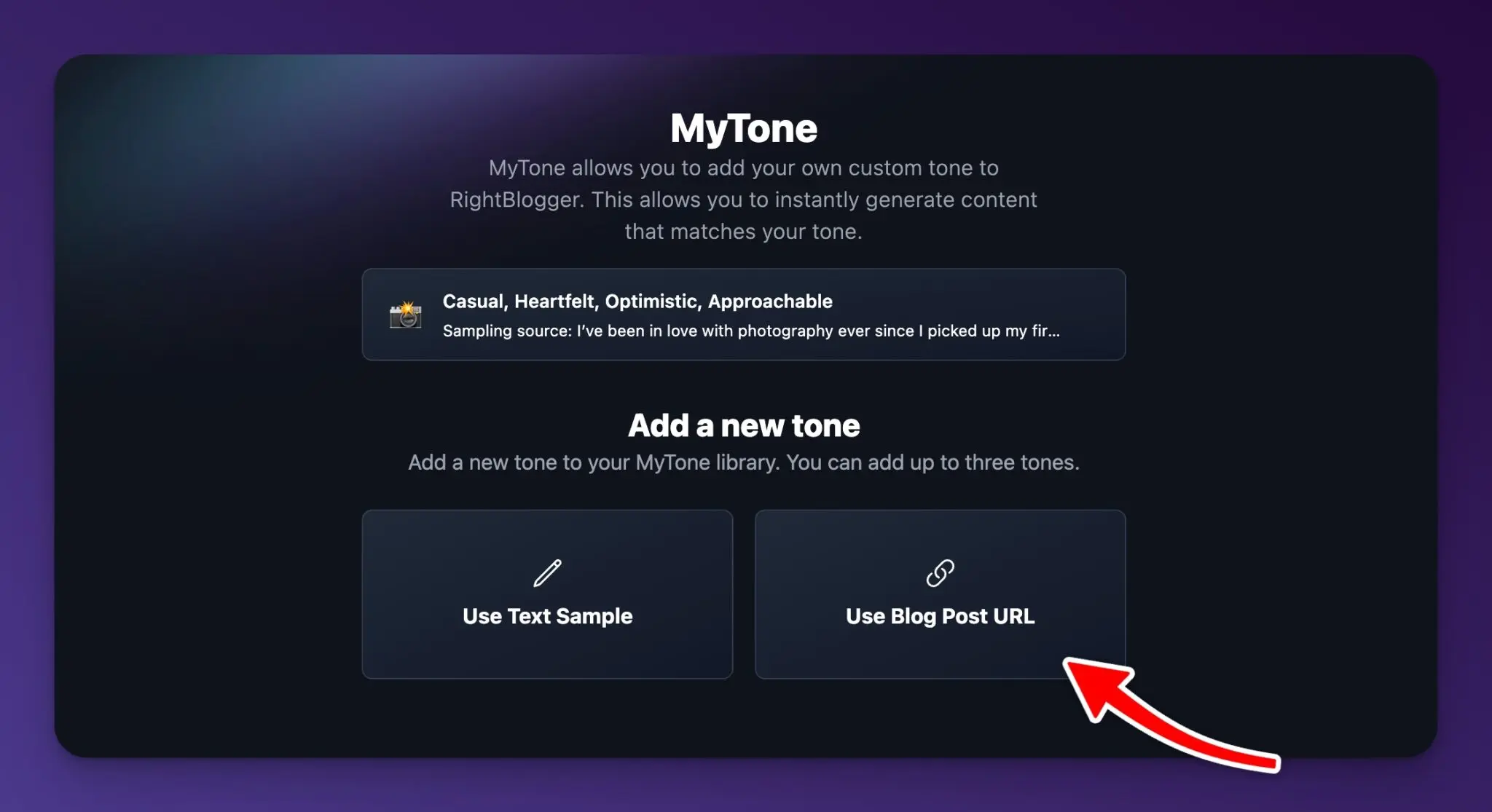 MyTone now lets you paste a blog post URL so RightBlogger can learn from your real writing. It studies your style and builds a custom tone that matches how you already write.