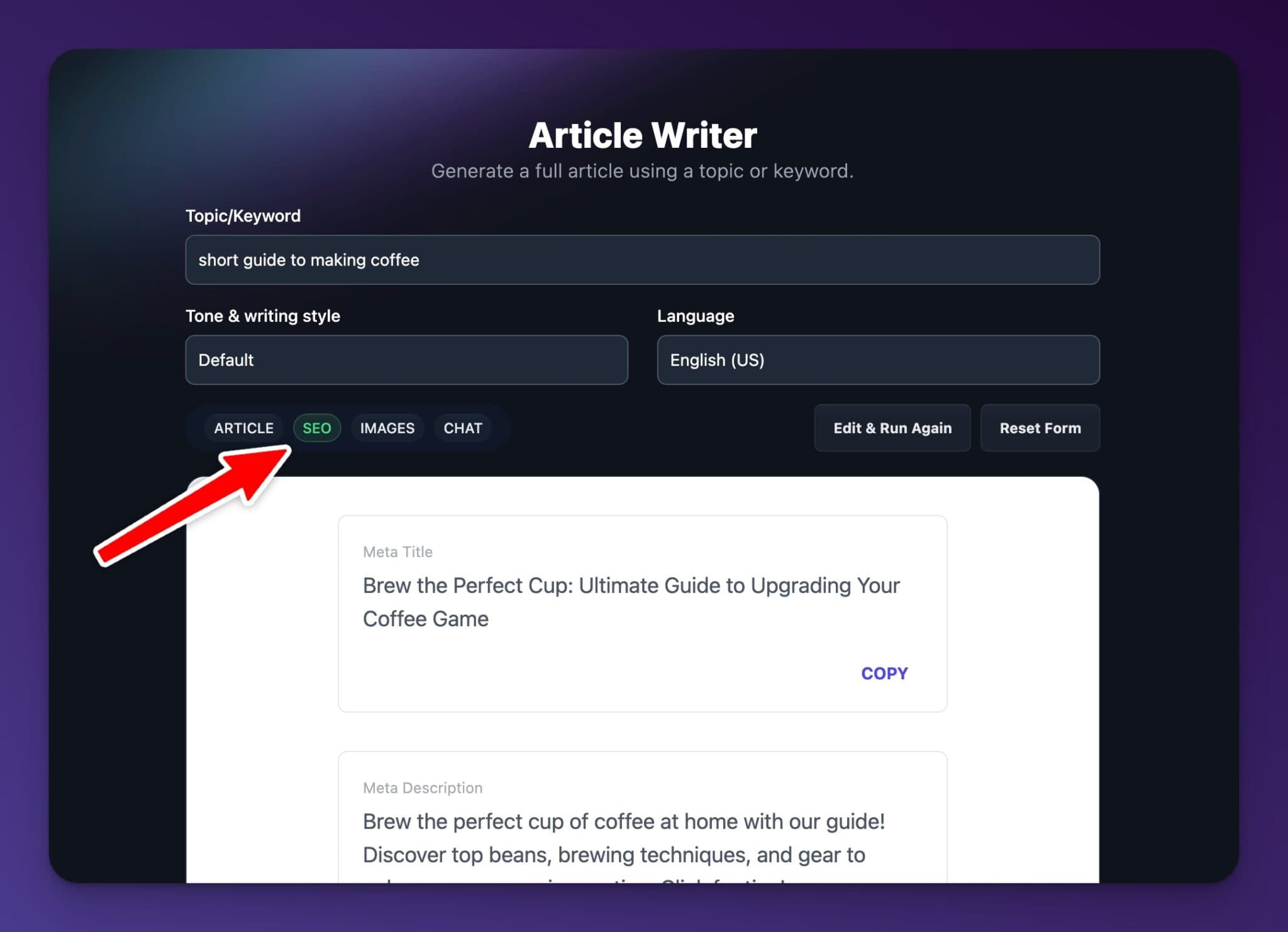 The new SEO tab gives you key SEO items for every article you create, like meta title, meta description, and permalink ideas. This means you do not have to guess or write these from scratch.