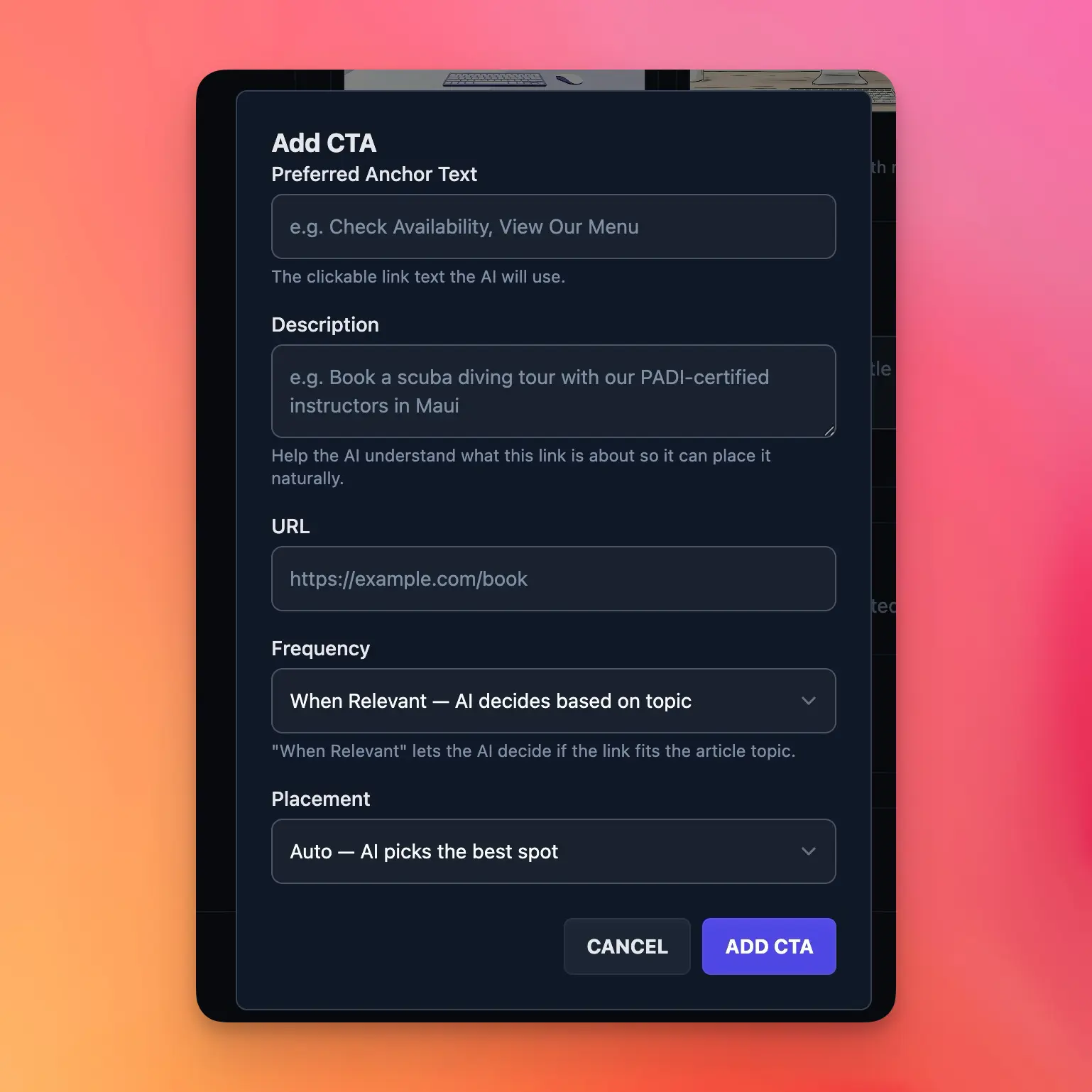 - Description — This is the most important field for good placement. It tells the AI what your link is about so it can decide where in the article it fits best. Be specific. Instead of “my product page,” write something like “Book a scuba diving tour with our PADI-certified instructors” or “Sign up for our free blog writing toolkit.” The better your description, the more naturally the AI places your link.