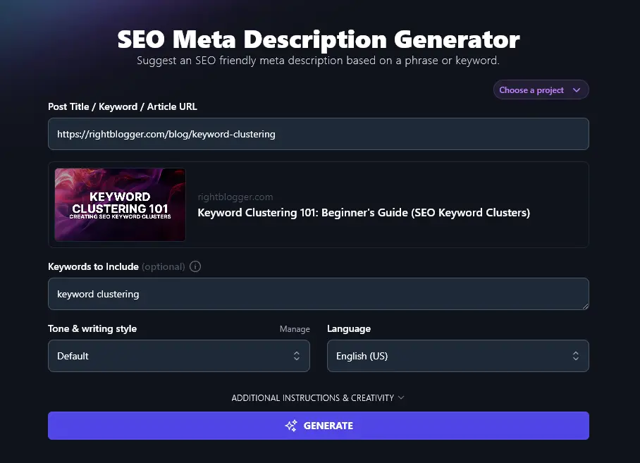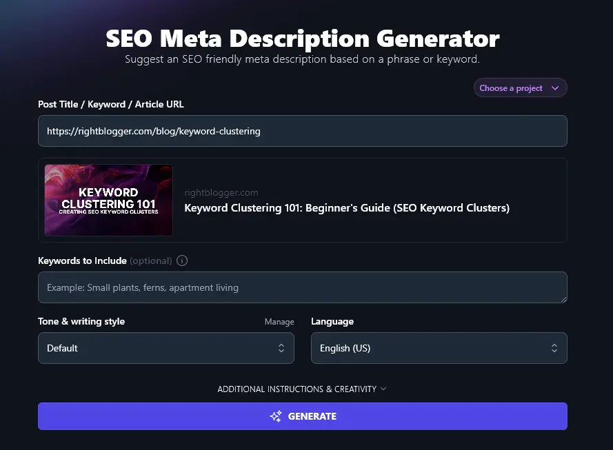 Most of RightBlogger’s tools include a “Tone & Writing Style” dropdown—and the meta description too is no exception. While the tone and style make more difference in a longer piece of text, like a full blog post, they can still subtly affect your meta description.
