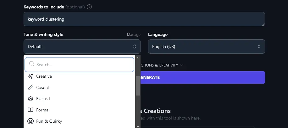 If you have a strong voice for your blog, you may want to reflect that in your meta descriptions. The dropdown gives you 20+ pre-set styles to choose from, like “Casual”, “Fun & quirky”, “Professional” and “Academic”.