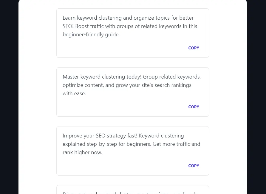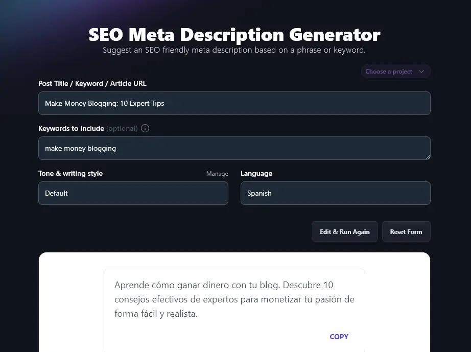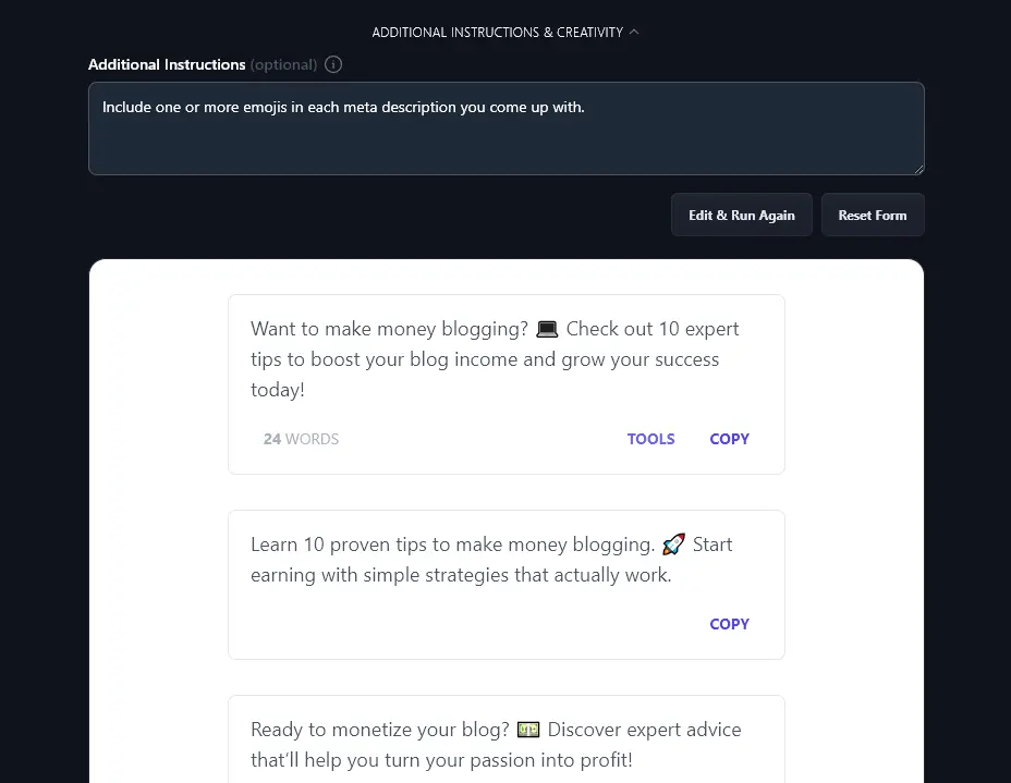 You could even run the meta description generator multiple times to get descriptions in several languages (e.g. for multilingual blog content).