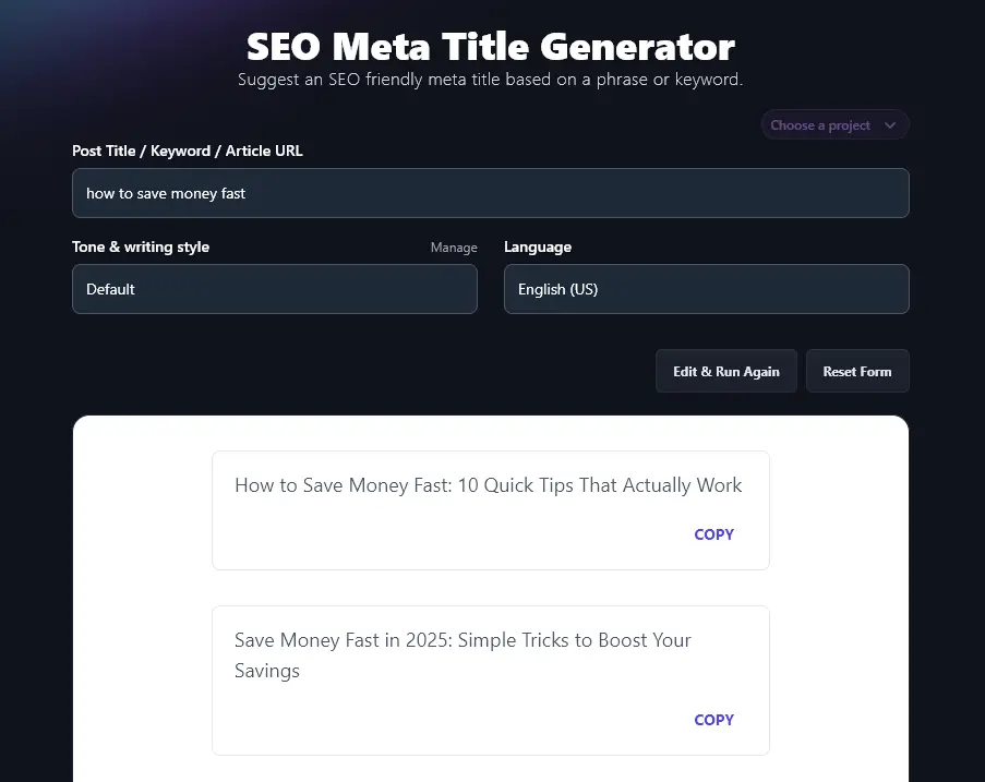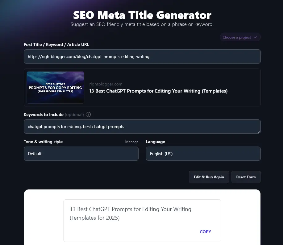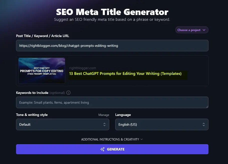 Like all RightBlogger’s generative AI tools, the SEO meta title generator lets you choose your “Tone & writing style”. This subtly adjusts your meta title to suit your brand—while keeping it well-optimized for search engines and click-throughs.