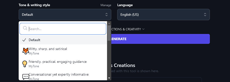 The “Tone & Writing Style” dropdown lets you choose a specific style to use in the generated meta titles. While many bloggers find the “Default” style works just fine for their content, you may want to experiment with different options to see which (a) sound most like you and (b) are most likely to appeal to your audience.