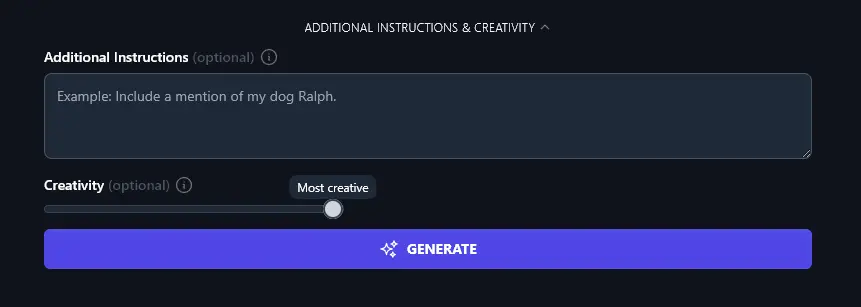 Just click on the “Additional Instructions & Creativity” link to open up the Additional Instructions box. Here, you can give the AI any extra details, requests, or constraints you want. Just add these in normal, human language.