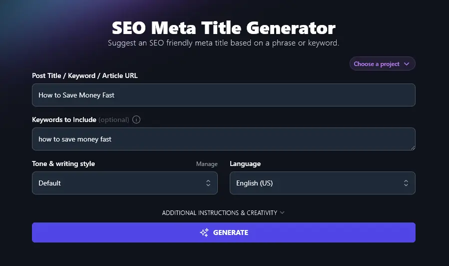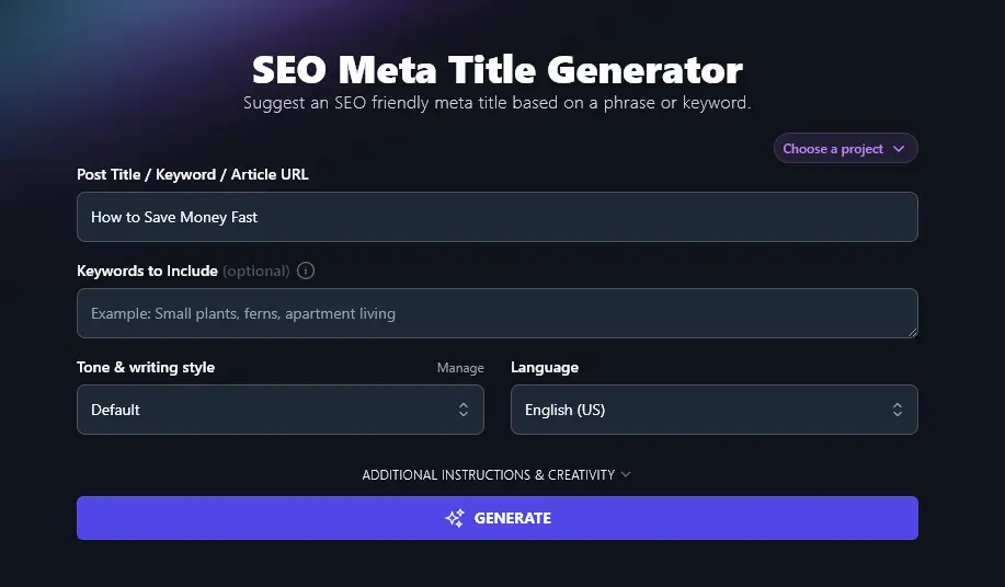 Your meta title is hugely important in getting your post to rank well for your chosen keyword. It can be tricky to craft a good meta title that incorporates your keyword, engages searchers instantly, and sticks within length limitations … but this AI tool can do all the hard work for you.