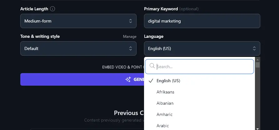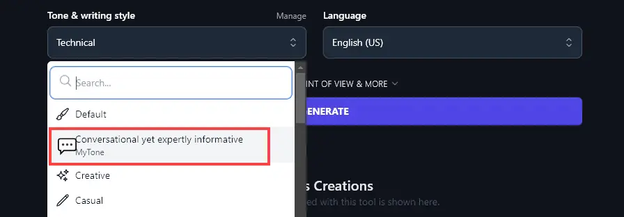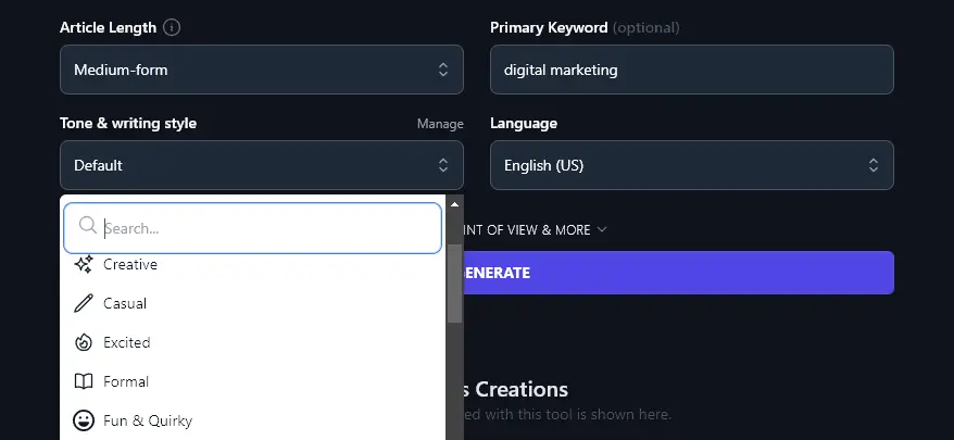 By default, the AI will write in a conversational tone that should be suitable for most blogs. But if you want to more closely match your own writing voice, select a different tone & writing style from the dropdown list.