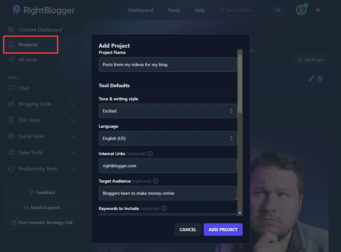 RightBlogger’s Projects feature lets you create a project and pre-populate the information in the Video to Blog Post Tool (and all our other tools).