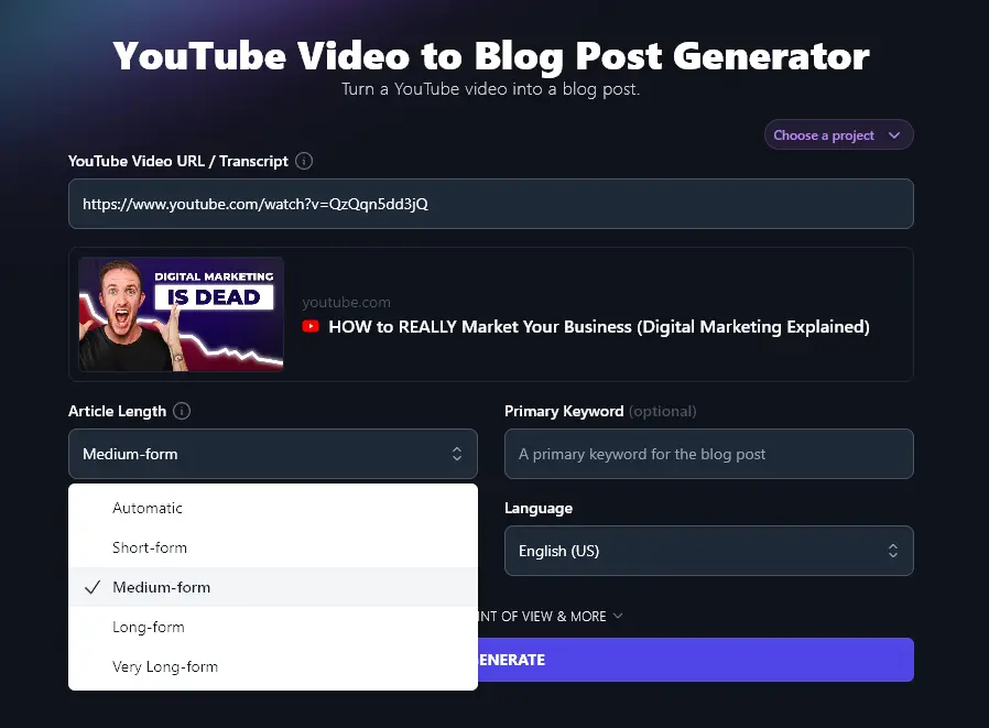 Short-form posts will normally be under 1,000 words; long-form posts will be around 1,500 words … though note that if your video itself is fairly short, the tool will end up producing blog posts that are on the shorter side too.