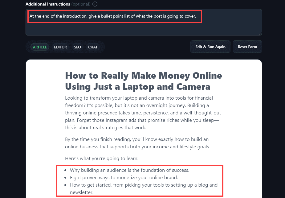 That might be information that you want added to the AI-generated content (e.g. “add a bonus section on…”) or it could be related to how you want the post formatted, perhaps if you use specific templates for your posts.