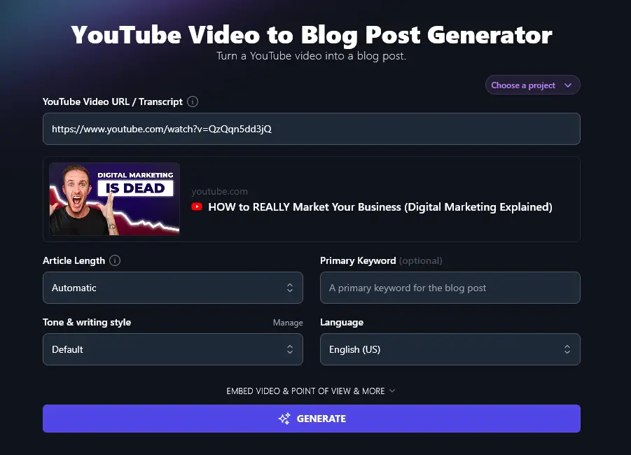 Reworking all your videos into blog posts would take a ton of manual work. Even if you’ve got a good, clear transcript, you’ll still need to do lots of editing and formatting. That’s why we created one of our most popular tools: the YouTube Video to Blog Post Generator.