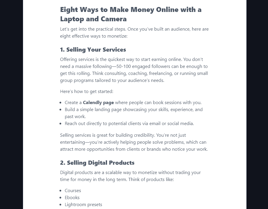 Direct: This guide will show you how to actually make money online using a laptop and camera. There are no shortcuts or overnight riches, but if you’re willing to put in the work, you can build a sustainable business and create time and location freedom.